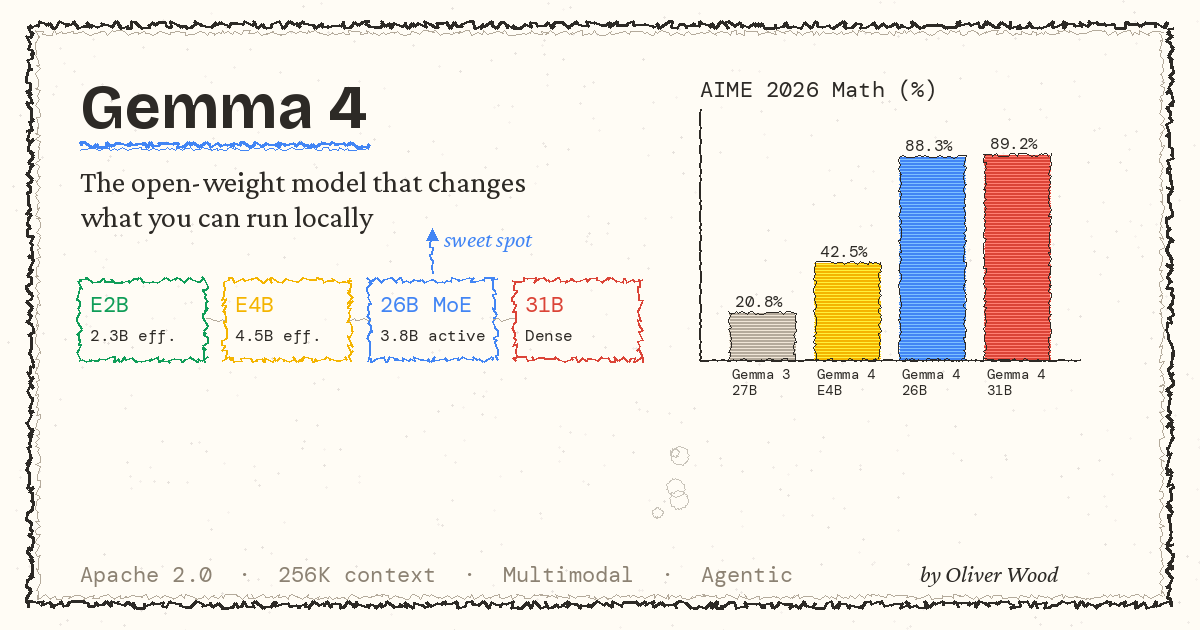 The two smaller variants — E2B (2.3B effective parameters) and E4B (4.5B effective) — use a technique called Per-Layer Embeddings to punch above their weight class. They're designed for phones, Raspberry Pis, and laptops. The E4B in particular is the one that caught my attention: it scores 42.5% on AIME 2026, which is more than double what Gemma 3 27B managed on the same math benchmark.