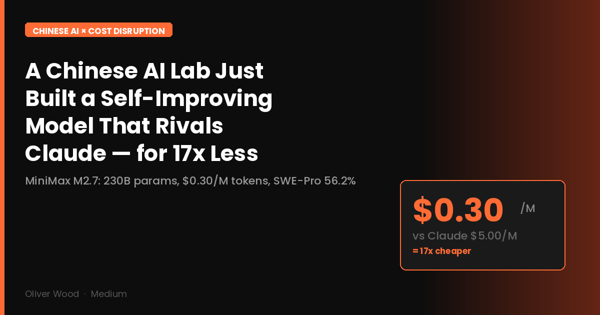 MiniMax M2.7 launched on March 18, 2026, with a claim that sounds like marketing hyperbole until you check the benchmarks: frontier-tier coding performance at $0.30 per million input tokens. For context, Claude Opus 4.6 charges $5.00 for the same volume. That's a 17× price difference.